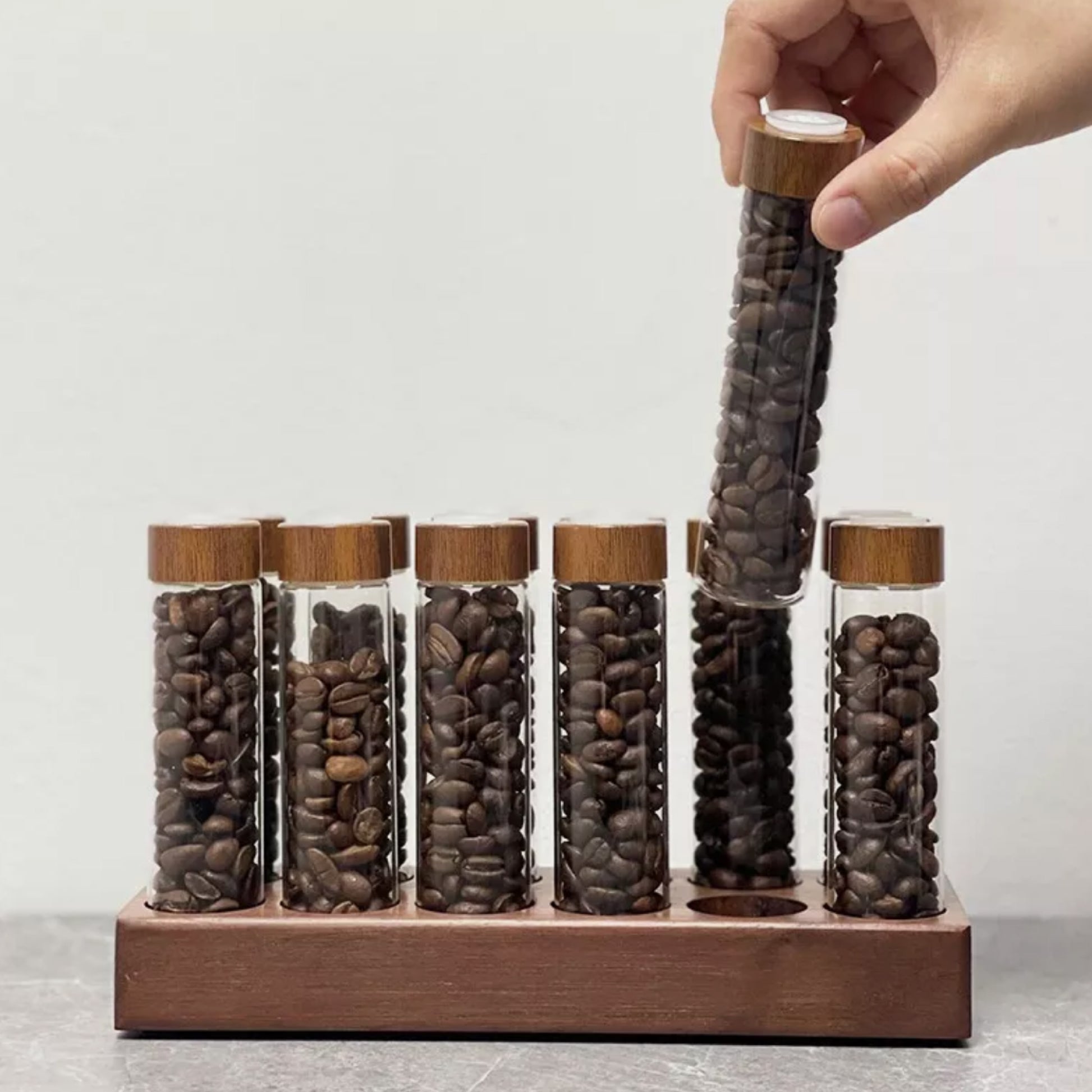 Fiecare recipient poate fi etichetat ușor pentru a indica originea, profilul de prăjire sau data prăjirii, oferind control deplin asupra organizării. Este o alegere excelentă pentru orice spațiu dedicat cafelei, fie că este vorba de acasă sau de un coffee shop profesionist.